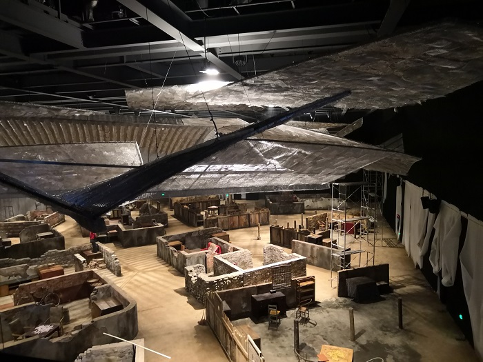 “云之中”是在開放的廣場(chǎng)上,由25座原生態(tài)川西民居屋頂配以大面積白色礫石鋪裝的廣場(chǎng)地面組成,在縹緲多姿的“霧森”和聲光效果中,營(yíng)造如夢(mèng)似幻的峨眉仙界和仙境般的夢(mèng)幻境界?!霸浦隆笔侨碎g。這里時(shí)光穿梭回1980年,當(dāng)時(shí)的峨眉山市高河村80戶、27個(gè)院子、248人生活的點(diǎn)點(diǎn)滴滴及深圳建筑公司來(lái)村招工,不同家庭、人群的真實(shí)寫照?!霸浦隆眲?chǎng)保留了峨眉山川主鎮(zhèn)高河村舊村搬遷遺址中的27個(gè)院落、48棟樓房和395個(gè)房間,以逼真的場(chǎng)景設(shè)計(jì)、飽滿的人物塑造以及4355件極具歷史感的老物件描摹出上個(gè)世紀(jì)80年代的“農(nóng)村圖鑒”
