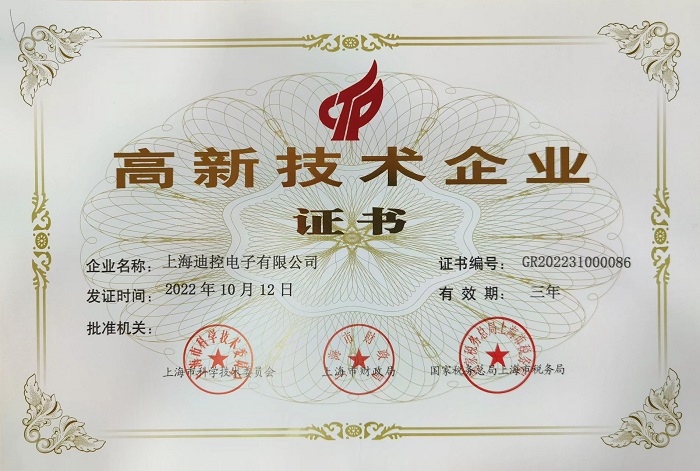 恭喜上海迪控榮獲上海市高新技術(shù)企業(yè)證書(shū)