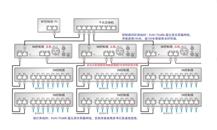 傳輸距離: 采用超五類非屏蔽網(wǎng)線,控制盒間的距離可為 100 米, 【SN 盒主從機(jī)光耦信號(hào)】傳輸超 100 米請(qǐng)另選方案; 【以太網(wǎng)協(xié)議】更遠(yuǎn)距離可以選用“光纖轉(zhuǎn)換器”,可達(dá) 5 公里