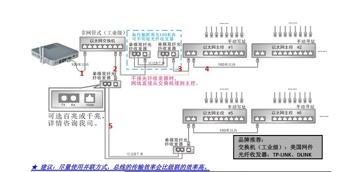 傳輸距離: 采用超五類非屏蔽網(wǎng)線(無氧銅,直徑 0.51mm 雙絞緊密,電阻小于 10 歐/300 米), 控制器間的距離可為 100 米; 更遠(yuǎn)距離選用“光纖轉(zhuǎn)換器”可達(dá) 5 公里