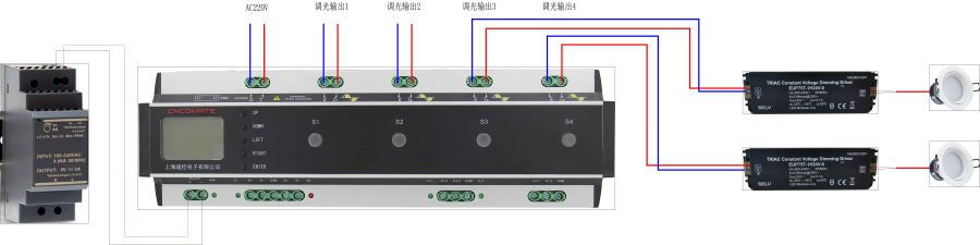 備注:負(fù)載如果是LED燈,在燈具和調(diào)光模塊之間需要加SCR可控硅調(diào)光驅(qū)動(dòng)電源; 如果是白熾燈、低壓鹵素?zé)舻茸栊载?fù)載,則可以直接接在調(diào)光模塊上。