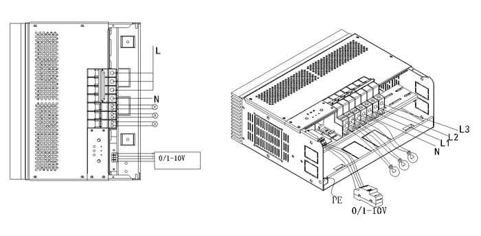 • 按照接線圖,連接各個(gè)輸入,輸出端子,0/1-10V端子。